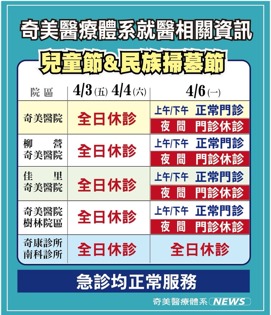 公告:115/04/03(五)~115/04/04(六)適逢兒童節暨民族掃墓節連假,健檢中心暫停服務,04/06(一)恢復正常營業。